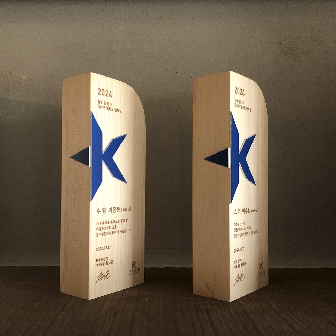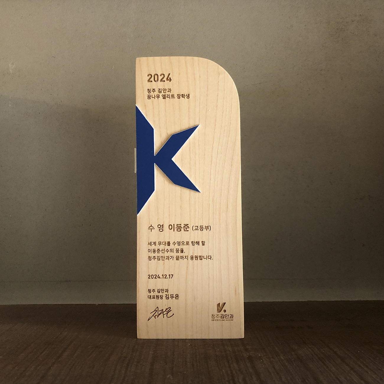 안과 시상식 트로피는 라운드진 상단 형태가 인상적입니다. 시야를 넓히고, 세상을 선명하게 보게 하는 안과 의료인의 역할을 은유적으로 담아냈습니다. 블루 컬러의 브랜드 아이덴티티가 나무 위에 절제되게 자리하며, 세련된 타이포그래피가 전문성을 더합니다.
