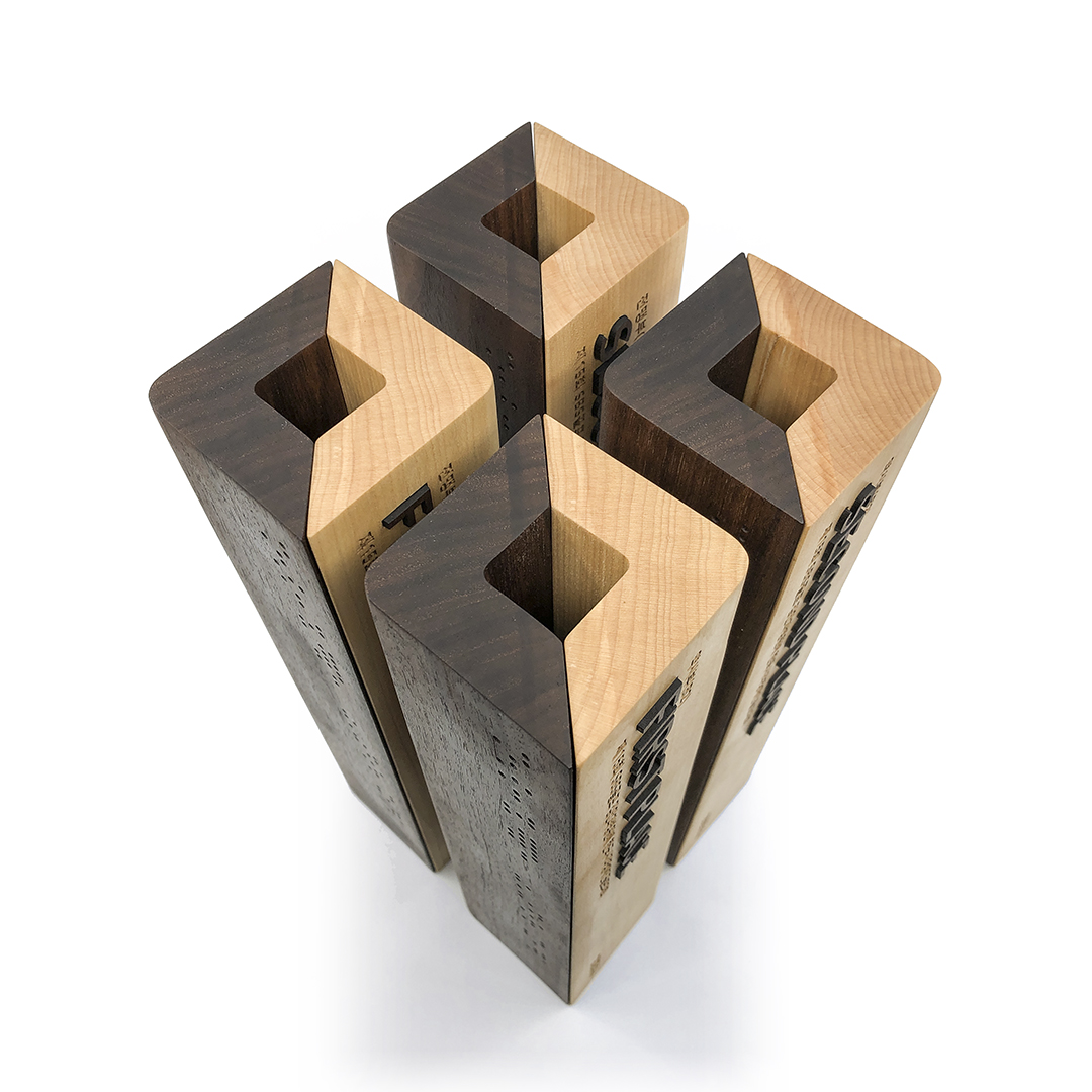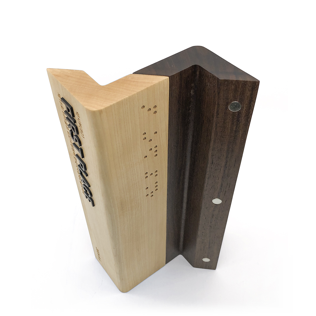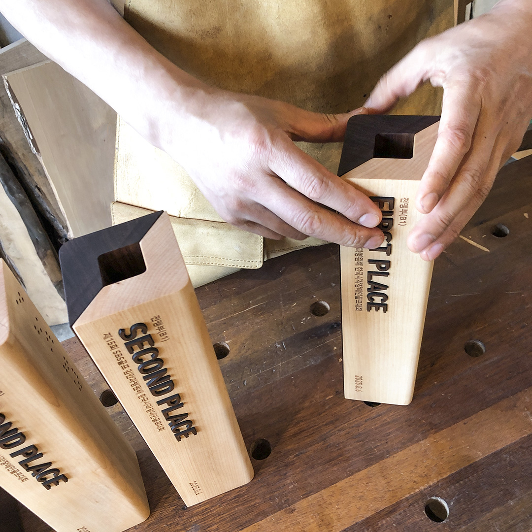 밝고 섬세한 메이플은 선수의 열정을, 묵직한 월넛은 서포터의 든든함을 표현하며, 자석으로 결합된 두 조각은 분리했다 다시 결합하면 계단 형태로 변화해 함께 성장하는 여정을 은유합니다. 메이플 면에는 수상 내역과 점자를 새겨 시각장애인 선수가 손끝으로 영광을 읽을 수 있도록 했습니다. 눈으로 보는 아름다움을 넘어 촉각으로 전해지는 축하, 그 진심이 담긴 트로피입니다.