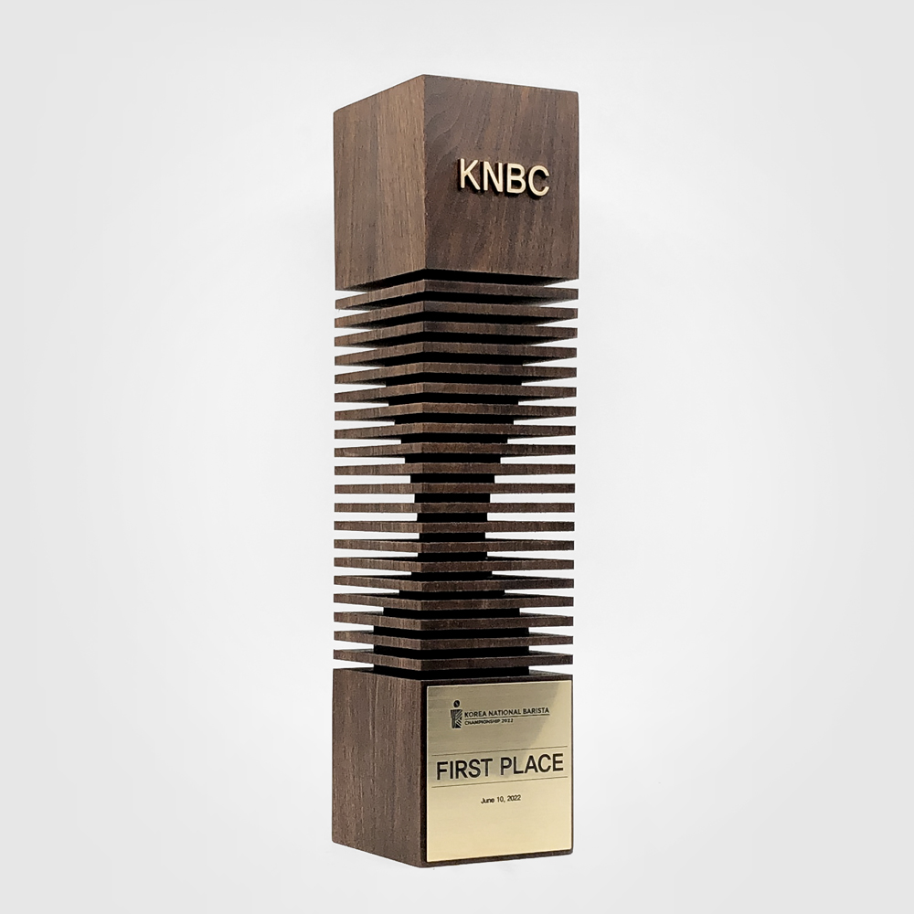 커피대회 KNBCnearbytrophy2026-01-27T10:35:17+09:00 커피대회 KNBCAbout This Project코리아커피챔피언십의 정통성을 담아낸 바리스타 대회 트로피입니다. 수평으로 적층된 나무 레이어 사이로 커피 추출의 핵심 도구인 탬퍼가 입체적으로 표현되어, 바리스타의 정교한 손끝 기술을 상징합니다. KNBC 로고가 각인된 상단부와 유기적으로 연결된 레이어 구조는 대회만의 시그니처 오브제로 작용하며, 심플하면서도 강렬한 인상을 남깁니다. 수상 순간의 퍼포먼스를 고려한 넉넉한 사이즈로, 우승의 무게감을 온전히 전달합니다.CATEGORY:시상식 트로피LINKS:블로그