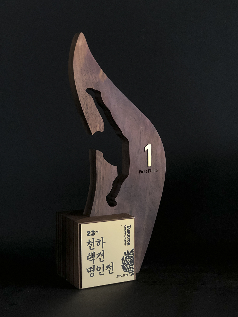 민족 무예 택견의 정수를 가리는 최고 권위의 무대, ‘천하택견 결정전’의 주인공을 위한 커스텀 원목 트로피입니다. 부드러운 듯 강한 택견의 ‘능청’과 ‘품밟기’에서 느껴지는 곡선의 미학을 원목 조형물로 형상화했습니다. 짙고 묵직한 월넛 베이스는 전통 무예의 깊은 뿌리와 신뢰를 상징하며, 중앙의 음각 처리가 만드는 빛과 그림자가 입체감을 더합니다. 위로 뻗어 올라가는 단단한 원목 오브제는 최고의 자리에 오른 천하택견꾼의 기개를 보여줍니다. 나뭇결이 살아있는 원목에 새겨진 정교한 각인은 승자의 영광을 영원히 기록합니다.
