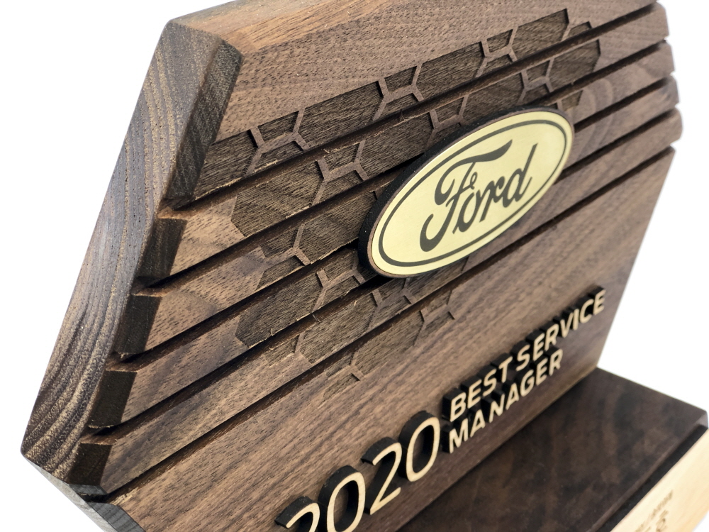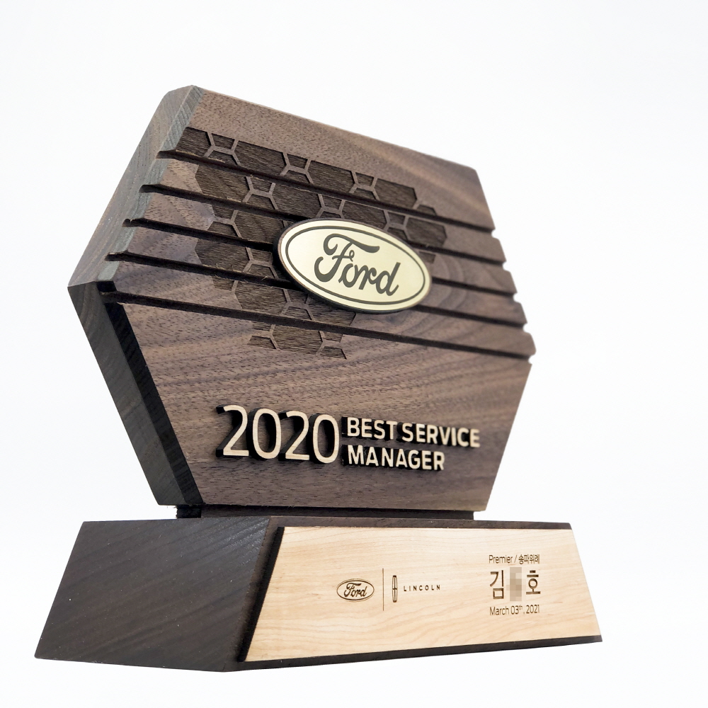 자연과 인간의 공존을 통해 ‘더 멀리 나아가는’ 포드의 철학을 담아낸 포드 링컨 아카데미 트로피입니다. 포드 링컨의 상징적인 SUV인 익스플로러의 그릴 디자인을 모티브로 하여, 조형적 아름다움과 공학적 신뢰를 상징하는 육각 벌집 구조를 원목으로 정교하게 구현했습니다. 친환경 자동차 시대를 선도하는 기술력과 환경을 생각하는 마음을 미래의 비전인 ‘나무’라는 물성에 투영했으며, 북미산 최고 등급의 월넛(Walnut)을 사용해 번영과 풍요의 의미를 더했습니다. 최고급 원목의 단단한 질감과 세련된 디자인의 조화는 포드 링컨이 추구하는 본질적인 가치를 완벽하게 전달합니다.