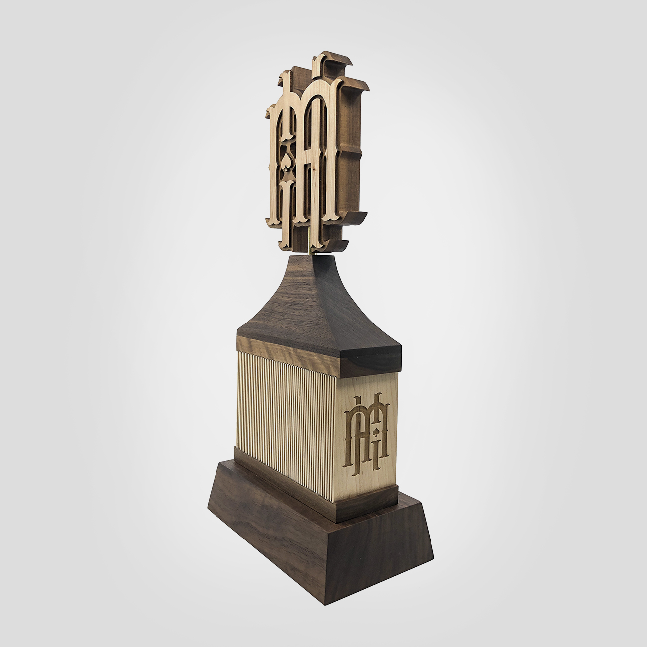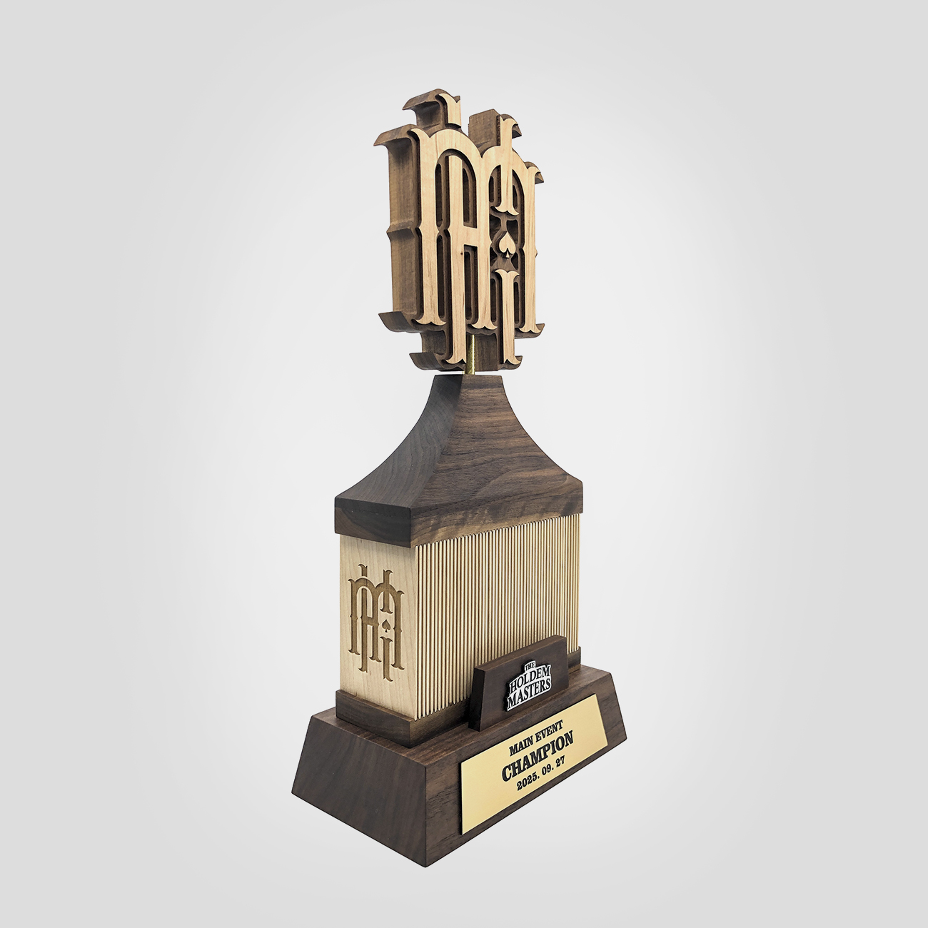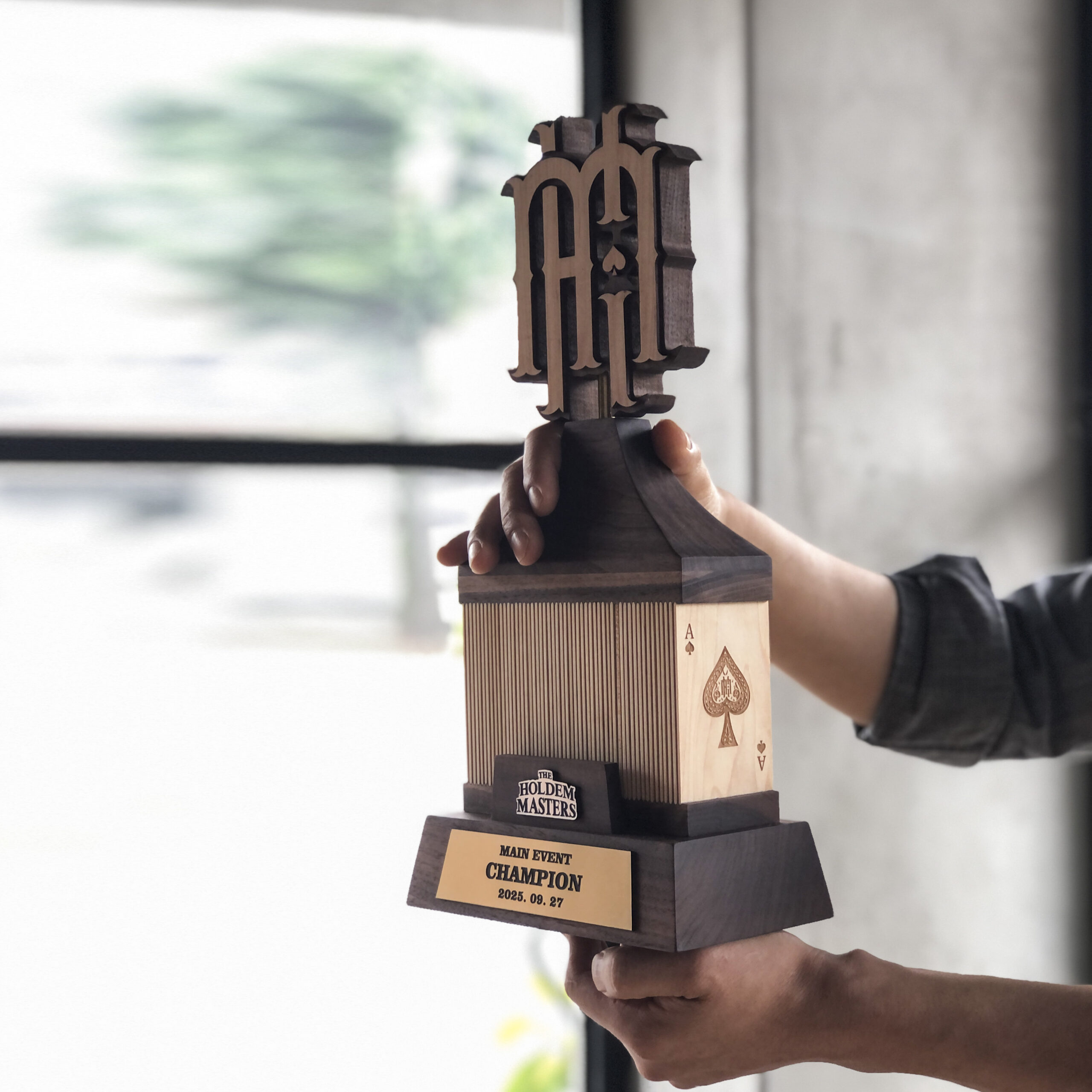 상단의 HM 로고 마크는 브랜드 비례를 살려 정교하게 제작했으며, 본체는 52장의 카드를 모티브로 전략적 완결의 순간을 상징합니다. 원목의 수직 라인이 홀덤 특유의 긴장감과 집중력을 표현하고, 측면의 스페이드 각인이 게임의 본질을 담아냅니다.