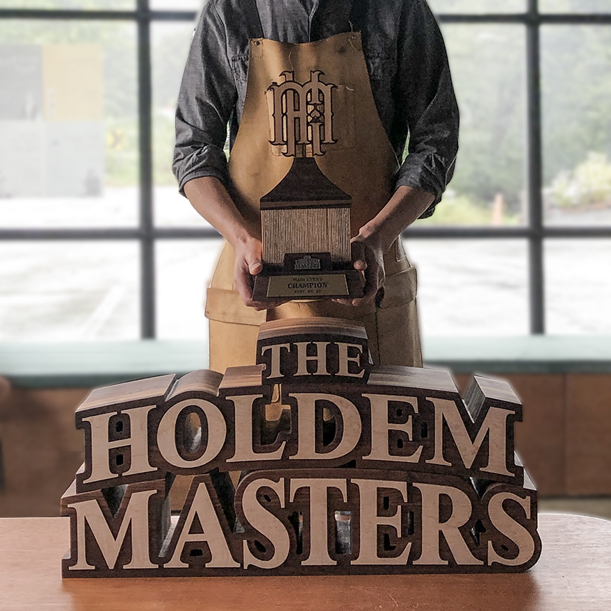 깊고 중후한 월넛과 밝고 단아한 메이플을 조화롭게 배치하여, 원목 특유의 따뜻함 속에 대회의 무게감을 고스란히 담았습니다. 서로 다른 수종이 만들어내는 선명한 대비는 조명 아래에서 빛과 그림자의 깊이를 더하며 로고의 가독성을 한층 높여줍니다. 여러 단계의 수작업 샌딩 공정을 거쳐 로고의 직선과 곡선을 완벽하게 구현했으며, 이러한 장인 정신이 공간 전체를 홀덤 마스터스의 무대로 압도하는 예술적 마스터피스를 완성했습니다.
