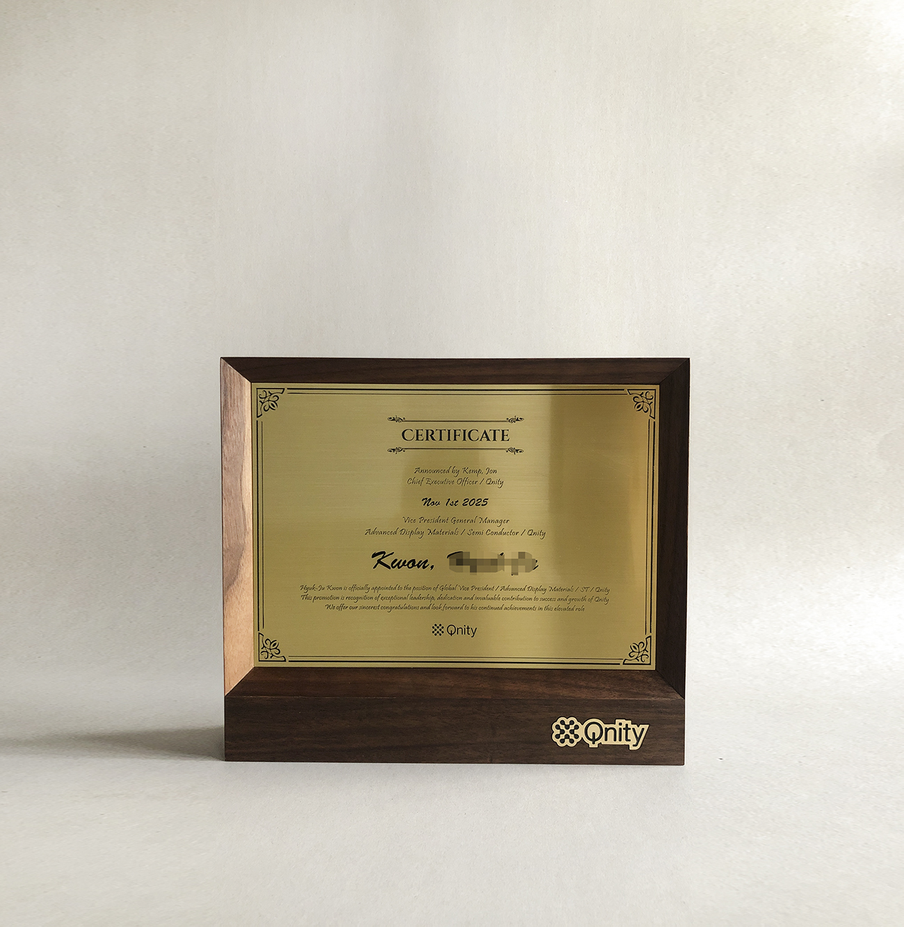불필요한 장식을 덜어낸 절제된 구조 속에서, 나무의 결은 조용히 존재감을 드러냅니다. 이는 임명이라는 순간이 요란한 선언이 아닌, 묵묵한 책임의 시작임을 상징합니다. 이 임명장은 기록을 보관하는 액자가 아니라, 한 사람의 시간과 역할을 정중히 세워두는 작은 기념비로 완성되었습니다.