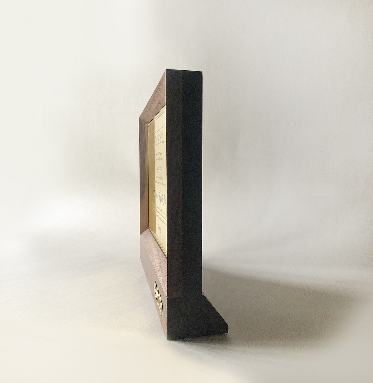 이 작업은 종이 위의 문서를 넘어, 그 무게를 공간 안에 남길 수 있는 형태를 만드는 데서 출발했습니다. 단단한 월넛 원목 프레임과 황동 플레이트의 조합은, 시간과 신뢰, 그리고 직책이 지닌 품격을 담아냅니다. 정면의 간결한 비례와 안정적인 하부 구조는 시선의 중심을 자연스럽게 문서로 모으면서, 동시에 오랜 시간 흔들림 없이 자리를 지키는 오브제가 되도록 설계되었습니다.