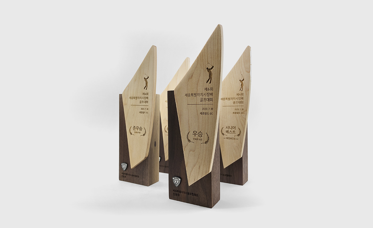 수직으로 세워진 블록에 WINNER, MEDALIST, LONGEST, NEAREST. 각각의 타이틀이 다크 우드와 라이트 우드의 조합 위에 새겨졌습니다. 나란히 세워두면 하나의 풍경이 되고, 따로 떼어 놓으면 각자의 성취가 됩니다. 월례회마다 달라지는 이름과 날짜, 그 기록들이 쌓여갈수록 트로피는 단순한 상이 아닌 그 모임의 역사가 됩니다.
