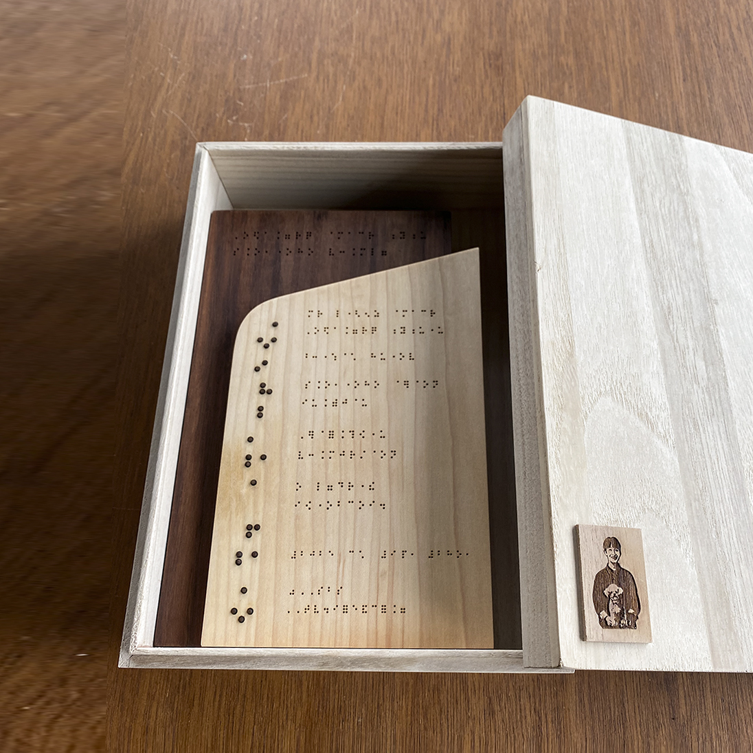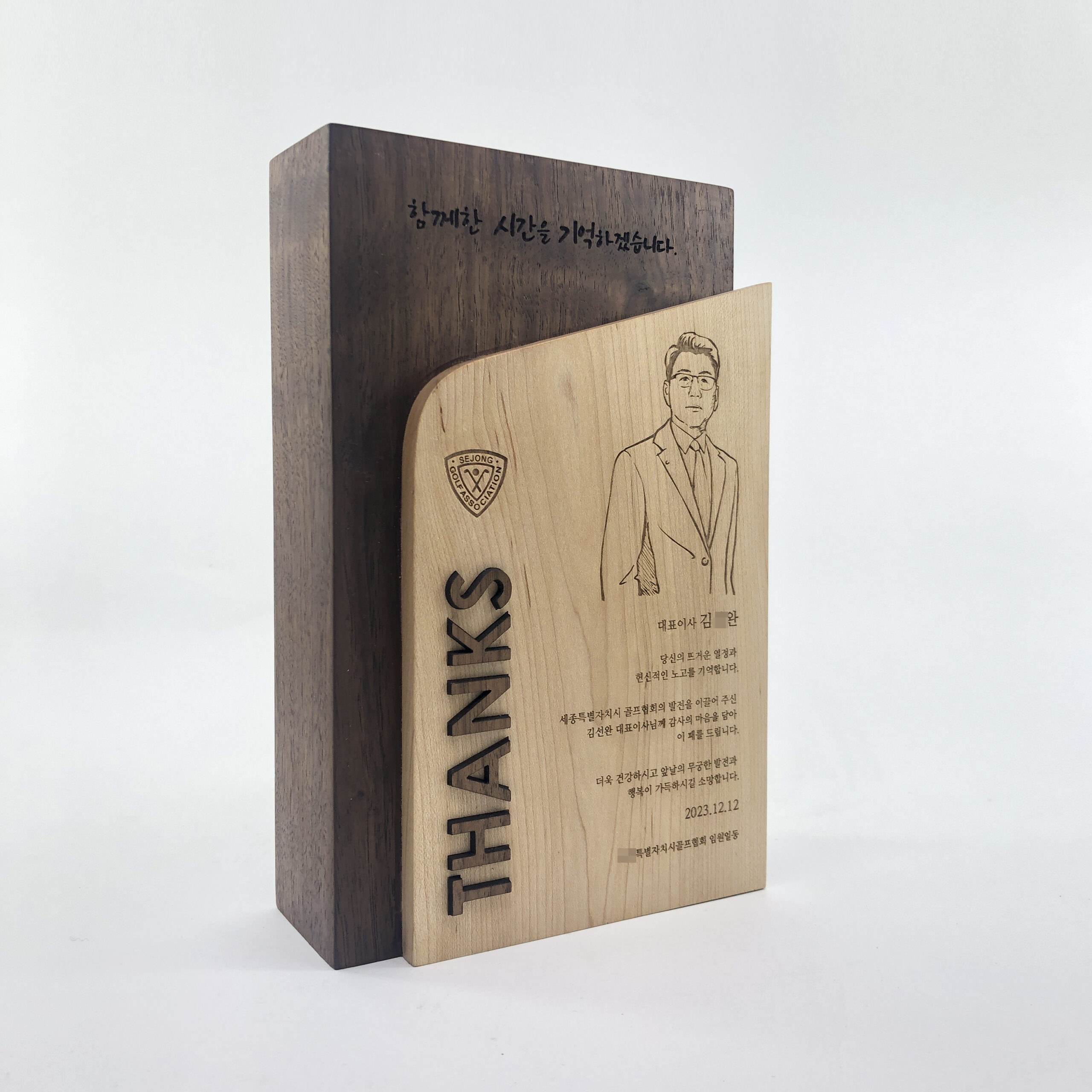 부드러운 곡선과 따뜻한 원목의 결이 어우러진 디자인이 특징입니다. 묵직한 월넛 위에 결이 고운 메이플이 치즈처럼 부드럽게 얹혀, 감사의 마음을 포근하게 전합니다. 감사의 문장, 인물 드로잉, 캘리그라피 등 어떤 메시지도 다정하게 감싸 안으며 받는 이의 마음에 오래 남는 선물이 됩니다.