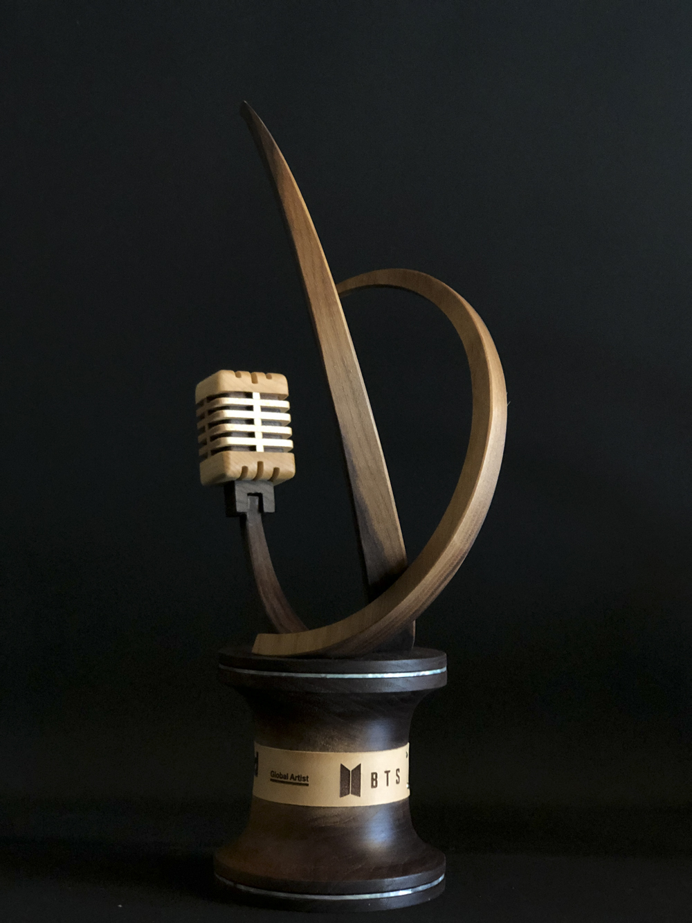 Kpop Billboardnearbytrophy2026-01-27T14:38:54+09:00 Kpop BillboardAbout This ProjectK-POP의 ‘K’를 한국적 곡선미와 역동성으로 재해석해 음악의 에너지와 무대를 향한 상승감을 형상화한 트로피입니다. 유려하게 휘어진 원목 곡선이 케이팝의 글로벌한 에너지를 표현하며, 그 중심에 빌보드를 상징하는 빈티지 마이크가 자리해 음악의 본질을 담았습니다. 원목 베이스의 안정감과 상단 조형물의 역동성이 대비를 이루며, 케이팝이 세계 무대로 뻗어나가는 순간을 형상화했습니다. 브랜드 로고가 각인된 디테일이 시상식의 권위를 더합니다.CATEGORY:시상식 트로피LINKS:블로그