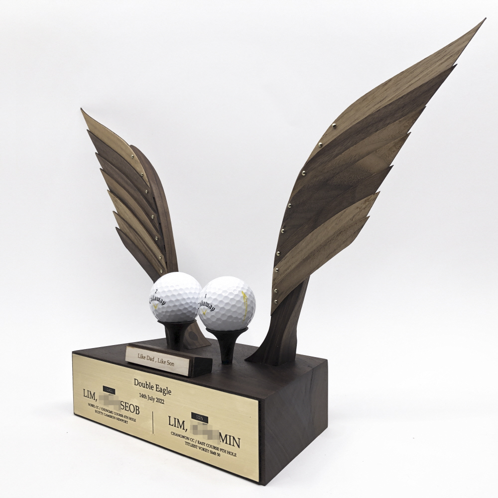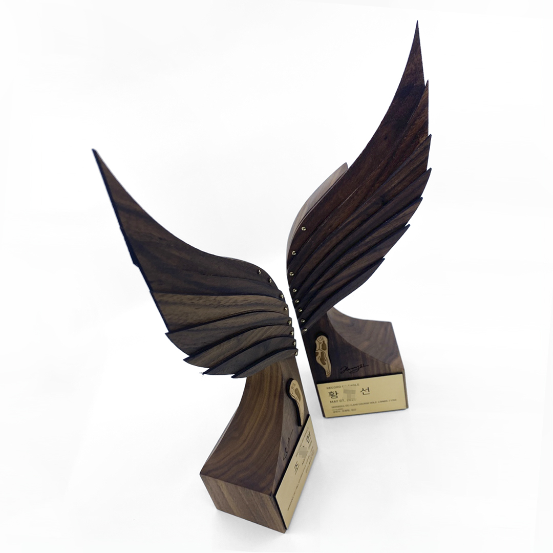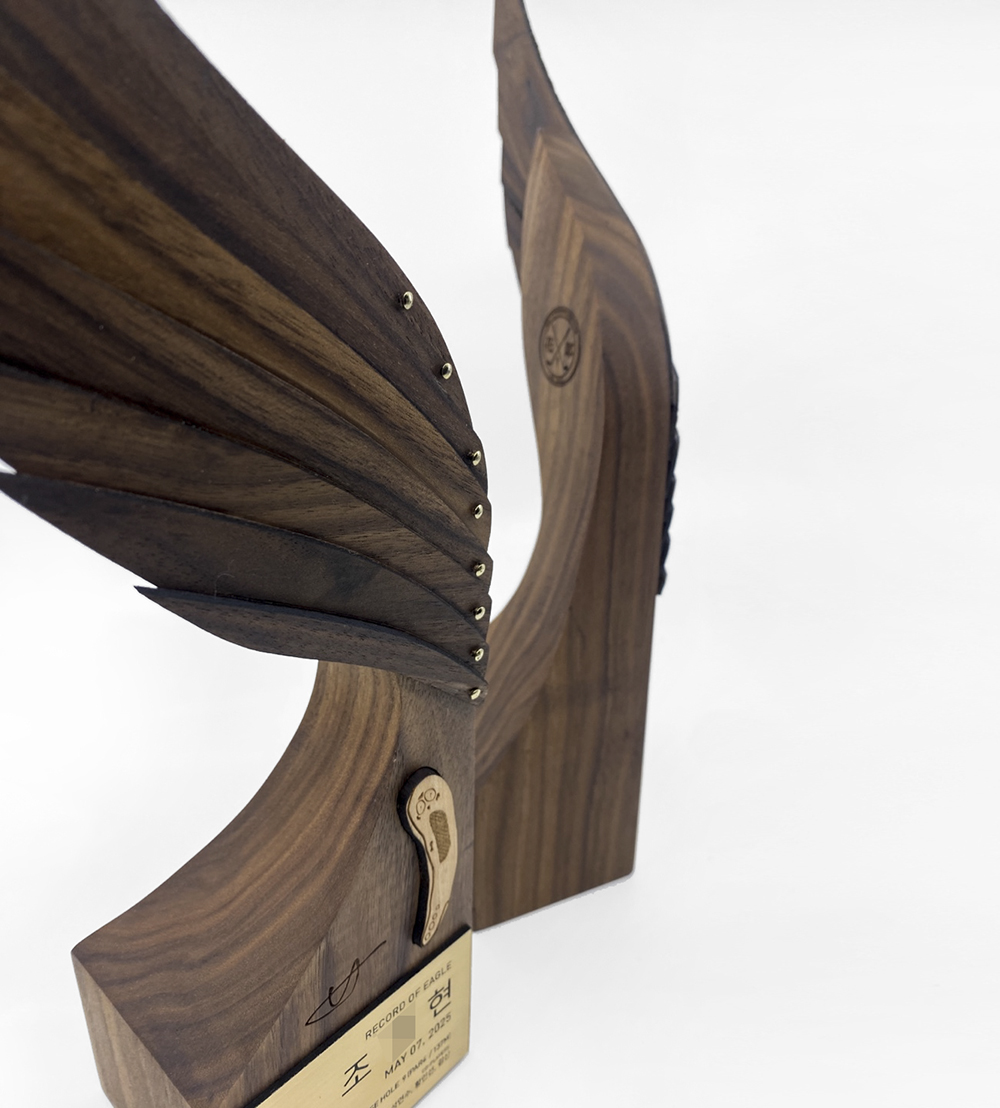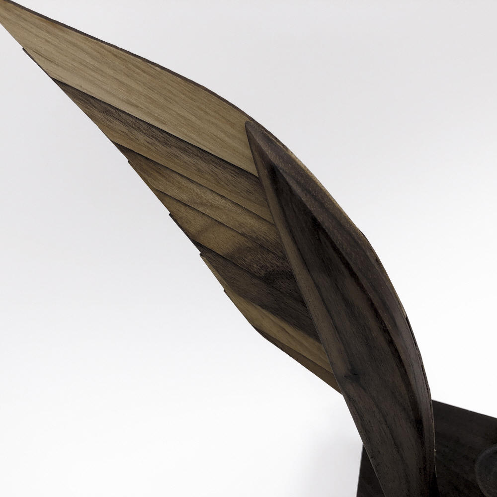 깃, 날개, 비상을 뜻하는 라틴어 PENNA. 독수리의 날개깃을 섬세하게 목공예 기술로 풀어낸 아트 트로피 라인입니다. 얇게 켜낸 월넛의 깃털은 실제 날개깃처럼 섬세하게 겹쳐져 리듬감 있는 레이어를 보여줍니다. 각 깃은 황동 리벳으로 고정되어 있으며, 역동적으로 조각된 날개 근육과 고요한 나뭇결의 조화는 트로피를 하나의 생동감 넘치는 조각 작품으로 승화시킵니다.