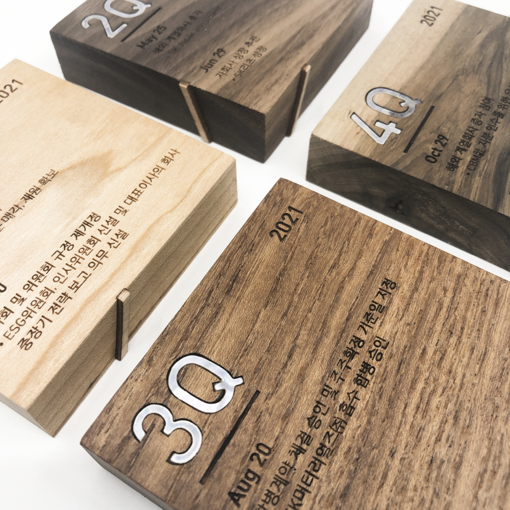 ‘사람을 키우듯 나무를 키우고, 나무를 키우듯 사람을 키운다’는 SK의 핵심 경영 철학을 모티브로 지주사로서 SK 그룹이 다져온 단단한 뿌리와 성장의 기록을 나무의 나이테처럼 켜켜이 쌓아 올린 큐브형 디자인의 기념패입니다. 분기별 성과와 주요 기록들을 원목 조각 하나하나에 정교하게 각인하여, 기업이 걸어온 ‘시간의 층’을 시각적으로 형상화했습니다. 나무의 결이 그대로 살아있는 메이플과 월넛의 조화는 자연과 공존하는 기업의 철학을 보여주며, 시간이 흐를수록 가치가 깊어지는 나무처럼 SK의 미래를 함께 일구어가는 이들에게 헌정하는 품격 있는 기념 오브제입니다.